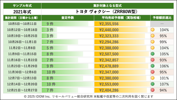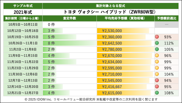 (1)トヨタ ヴォクシー 80系 ZRR80W型で査定件数最多の2021年式買取相場:過去12週間の推移
