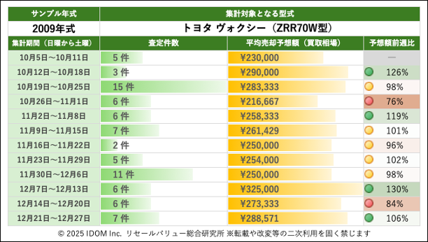 (2)トヨタ ヴォクシー 70系 ZRR70W型で査定件数最多の2009年式買取相場:過去12週間の推移