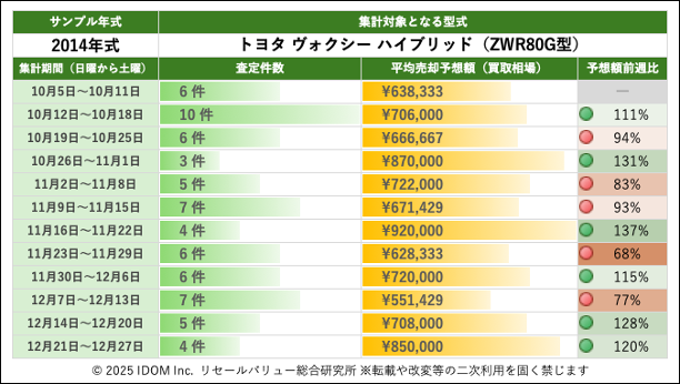 (3)トヨタ ヴォクシー ハイブリッド車 80系 ZWR80G型で査定件数最多の2014年式買取相場:過去12週間の推移