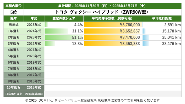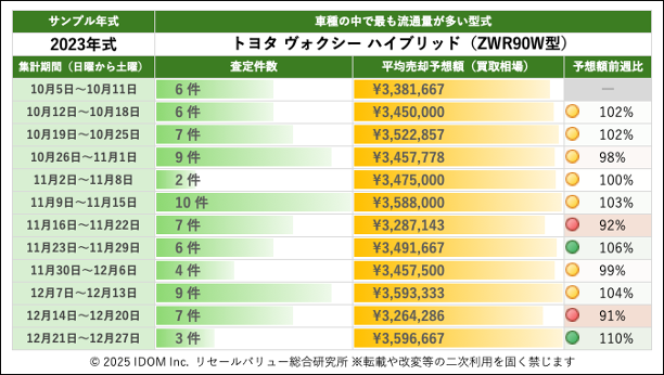 (5)トヨタ ヴォクシー ハイブリッド車 90系 ZWR90W型で査定件数最多の2023年式買取相場:過去12週間の推移