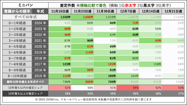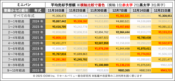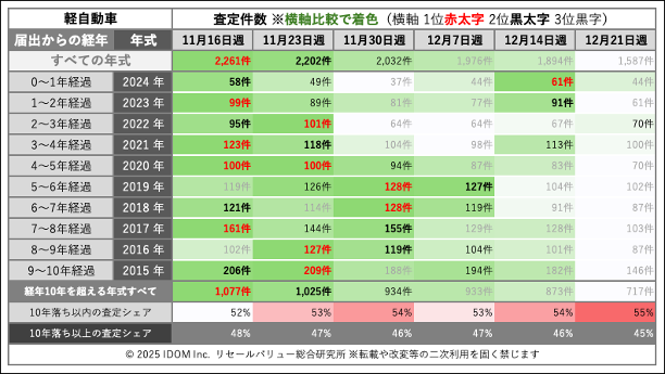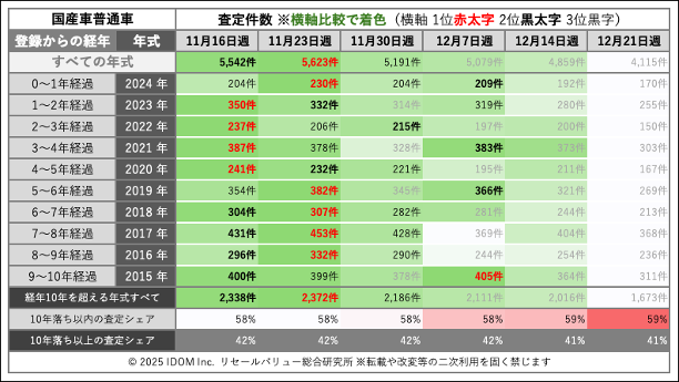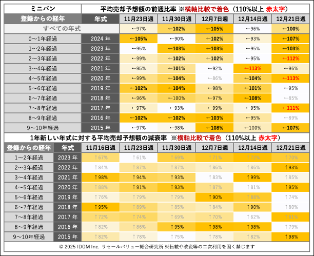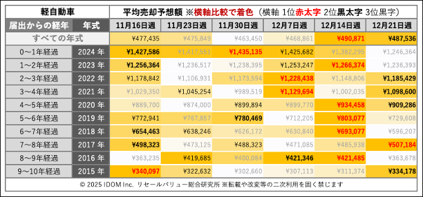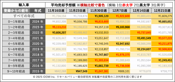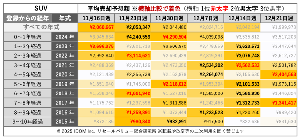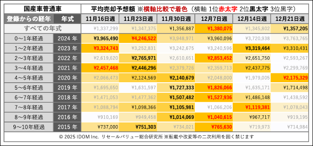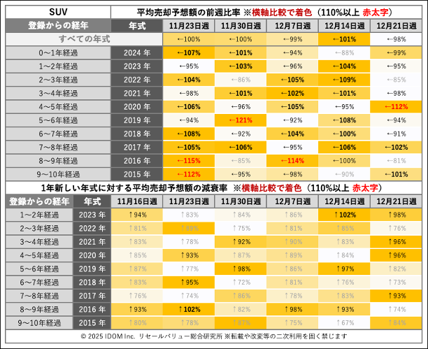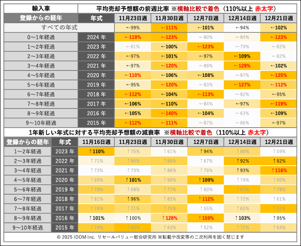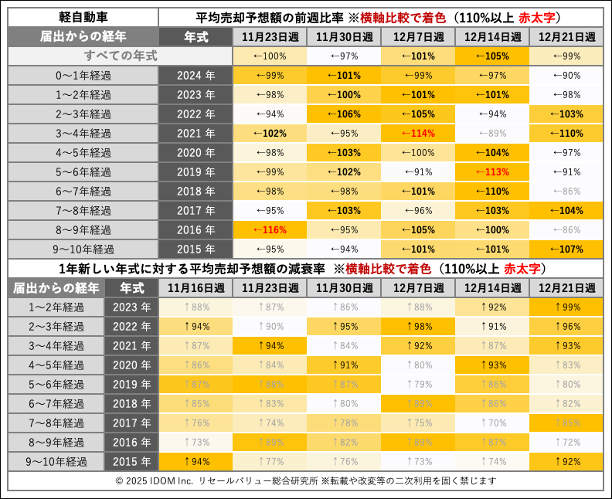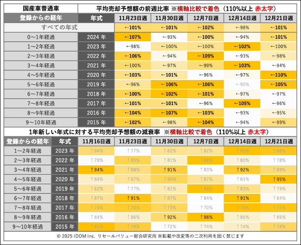 特に高年式の2024年式の下落は、年末の流通在庫調整による影響を強く受けている可能性もある。
