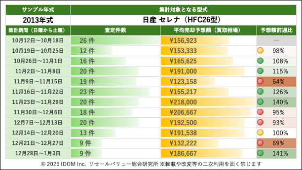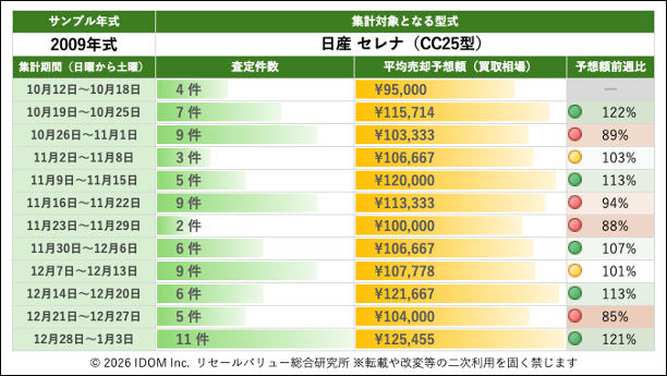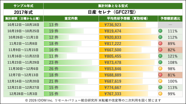 | 集計期間(日曜から土曜) | 査定件数 | 平均売却予想額(買取相場) | 予想額前週比 |