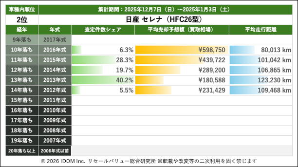 【日産 セレナ 型式2位】HFC26型で査定件数最多2013年式の買取相場推移