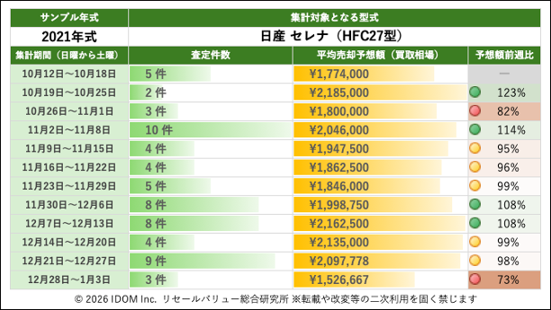 【日産 セレナ 型式3位】HFC27型で査定件数最多2021年式の買取相場推移