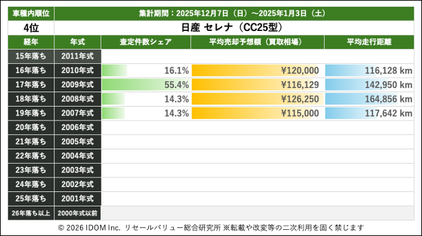【日産 セレナ 型式4位】CC25型で査定件数最多2009年式の買取相場推移