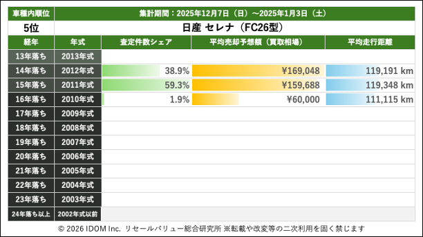 【日産 セレナ 型式5位】FC26型で査定件数最多2011年式の買取相場推移