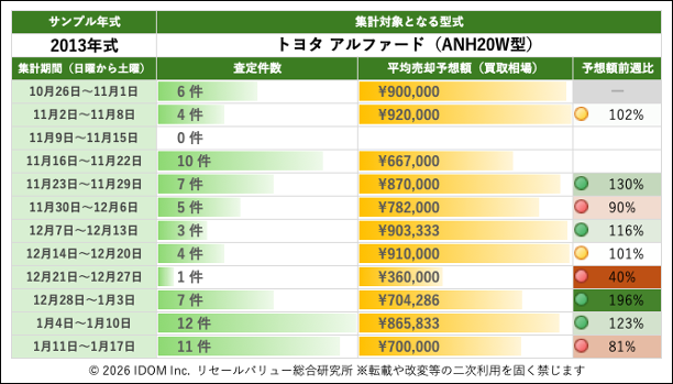 トヨタ アルファード 20系 ANH20W型で査定件数最多の2013年式買取相場:過去12週間の推移