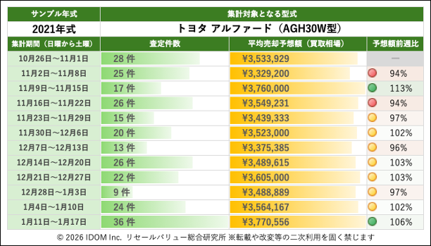 トヨタ アルファード 30系 AGH30W型で査定件数最多の2021年式買取相場:過去12週間の推移