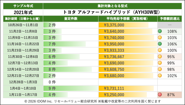 トヨタ アルファード 30系 AYH30W型で査定件数最多の2021年式買取相場:過去12週間の推移