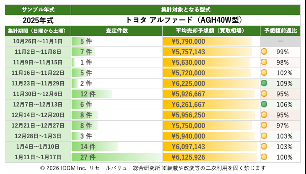 トヨタ アルファード 40系 AGH40W型で査定件数最多の2025年式買取相場:過去12週間の推移