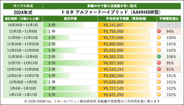 トヨタ アルファード 40系 AAHH40W型で査定件数最多の2024年式買取相場:過去12週間の推移