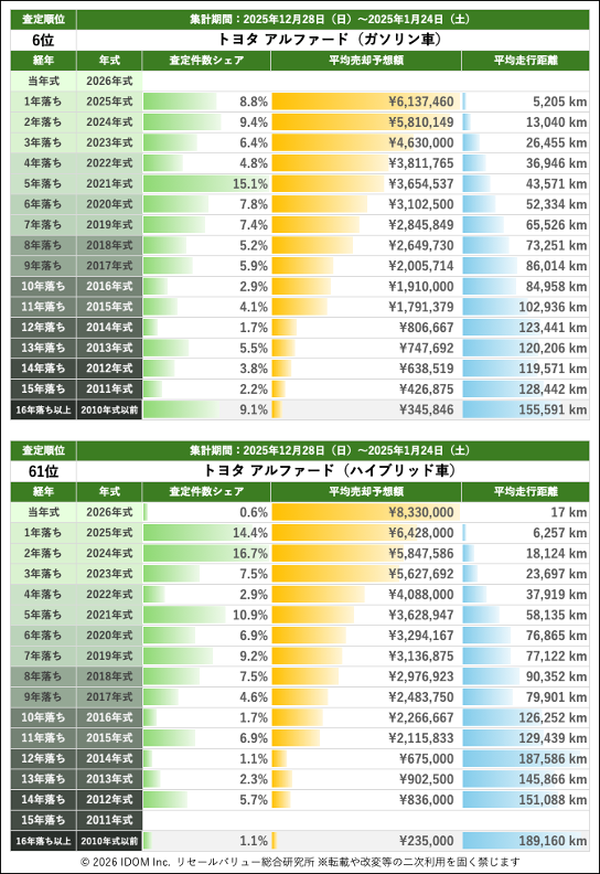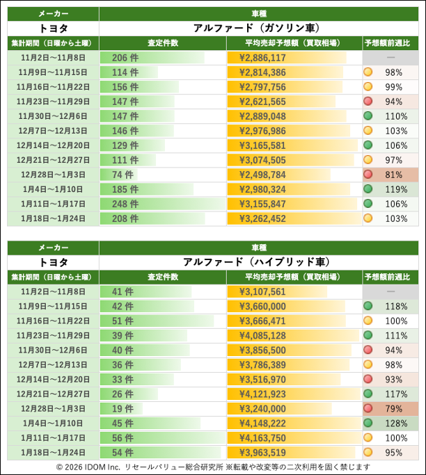【2026年1月24日(土)版】トヨタ アルファードの売却予想額(買取相場)速報