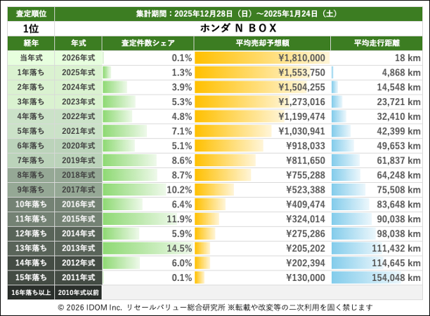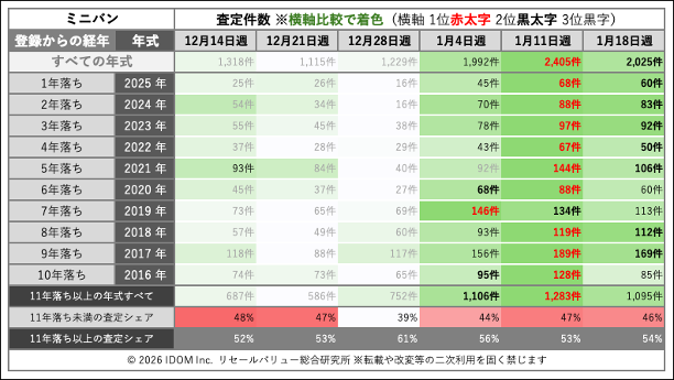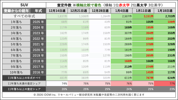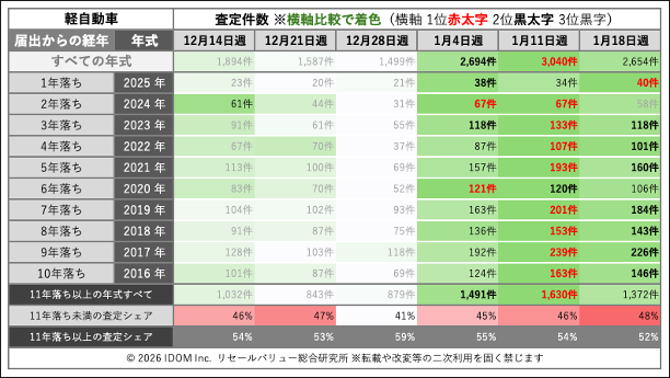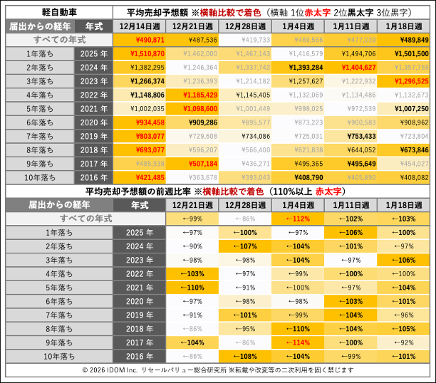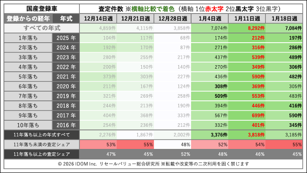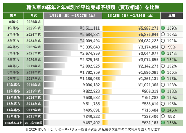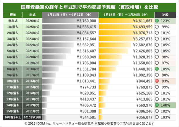 | 経年 | 年式 | 1月11日(日)〜1月17日(土) | 1月18日(日)〜1月24日(土) | 比較 |