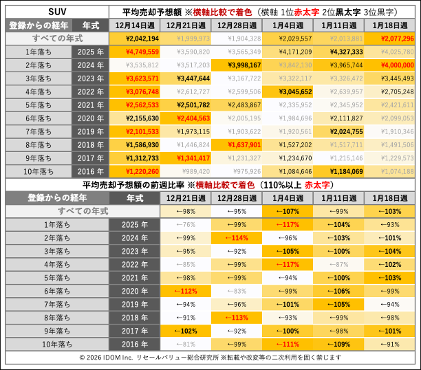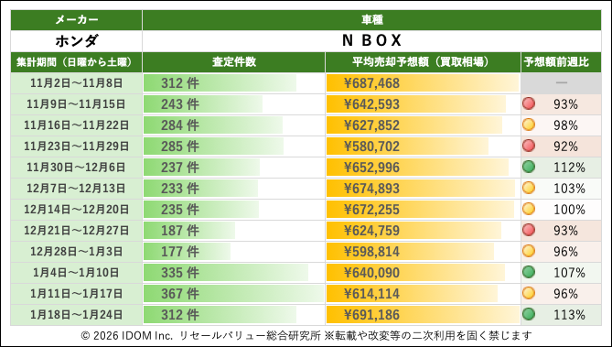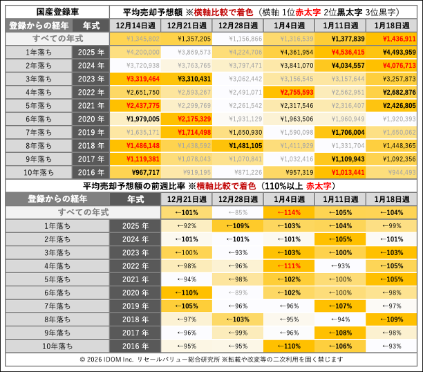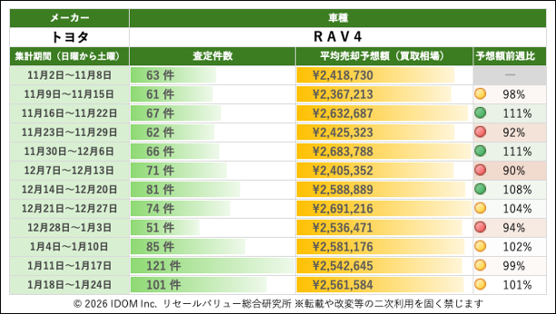 2026年第4週(1月18日週)の中古車買取査定件数と平均売却予想額