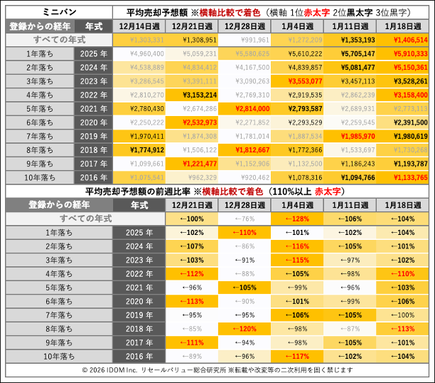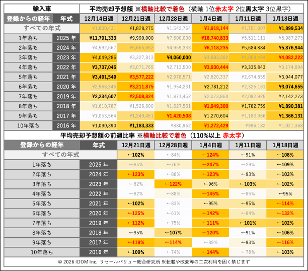 【週刊リセールバリュー】2026年第4週(1月18日週)の中古車買取相場/査定件数と売却予想額の推移