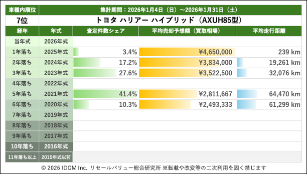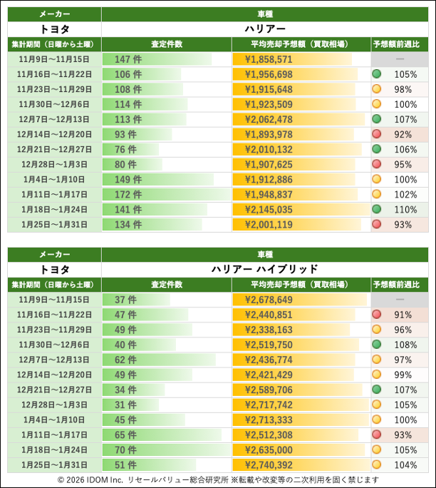 【2026年1月31日(土)版】トヨタ ハリアーの売却予想額(買取相場)リセールバリュー速報