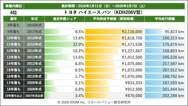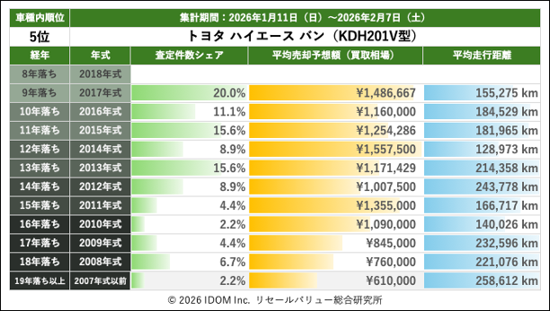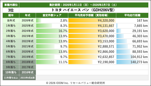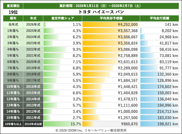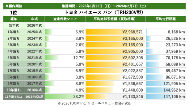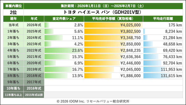 【2026年2月7日(土)版】トヨタ ハイエースバンの売却予想額(買取相場)速報