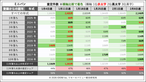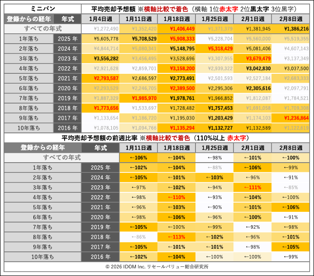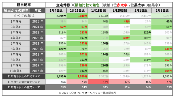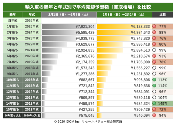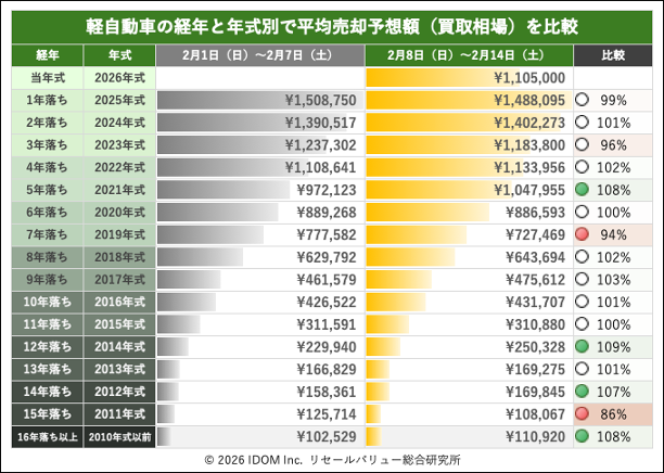 | 経年 | 年式 | 2月1日(日)〜2月7日(土) | 2月8日(日)〜2月14日(土) | 比較 |