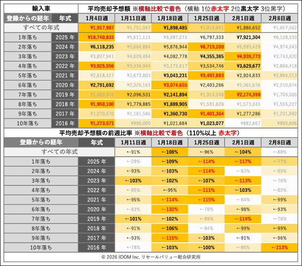 【週刊リセールバリュー】2026年第7週(2月8日週)の中古車買取相場/査定件数と売却予想額の推移