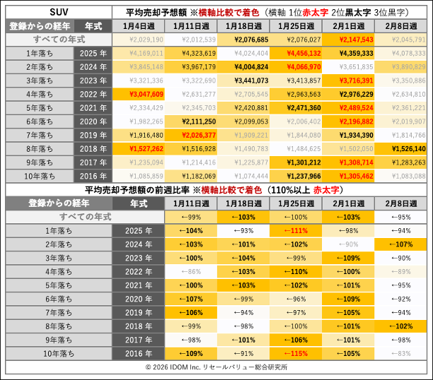 | SUVの経年と年式別で平均売却予想額(買取相場)を比較 | ||||