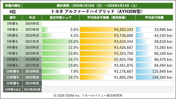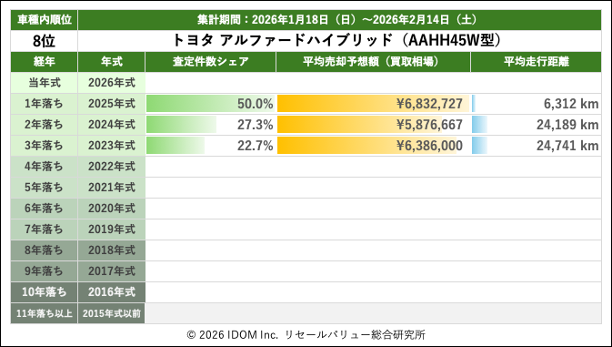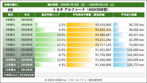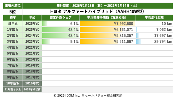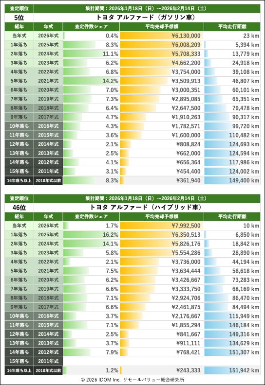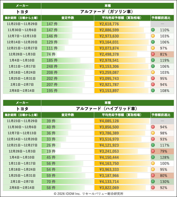 2026年2月14日(土)集計:トヨタ アルファードの売却予想額(買取相場)リセールバリュー速報