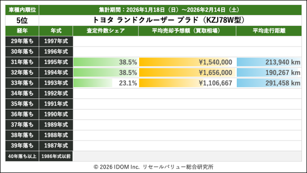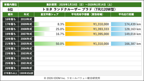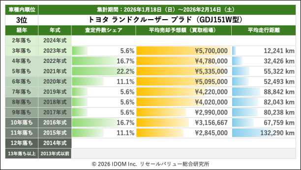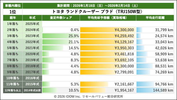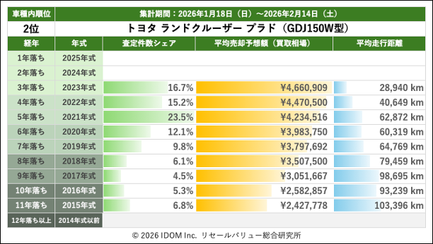 2026年2月14日(土)集計:ランドクルーザープラドの売却予想額(買取相場)リセールバリュー速報