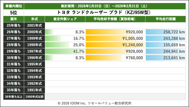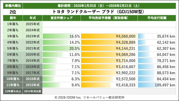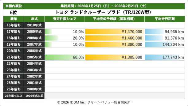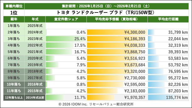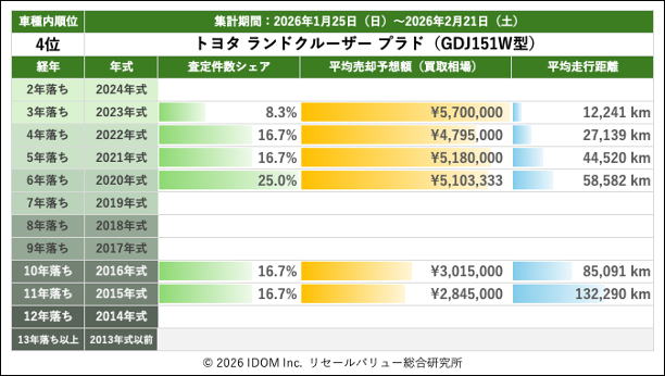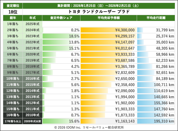 2026年2月21日(土)集計:ランドクルーザープラドの売却予想額(買取相場)リセールバリュー速報