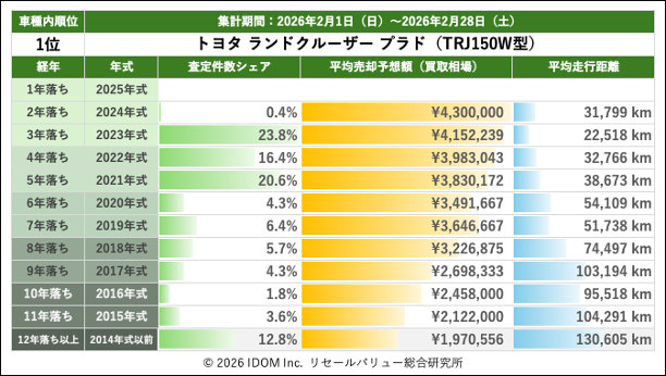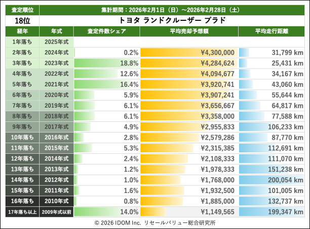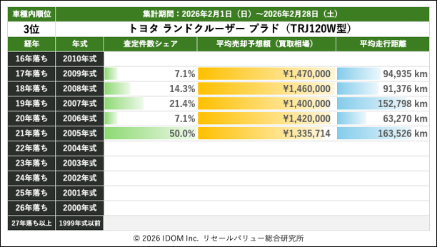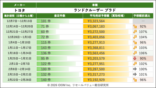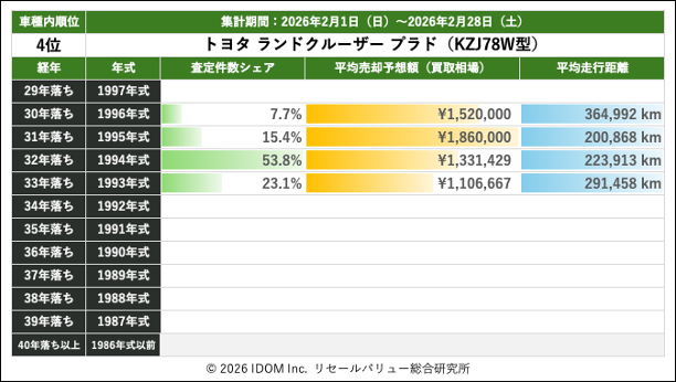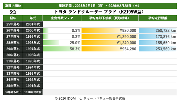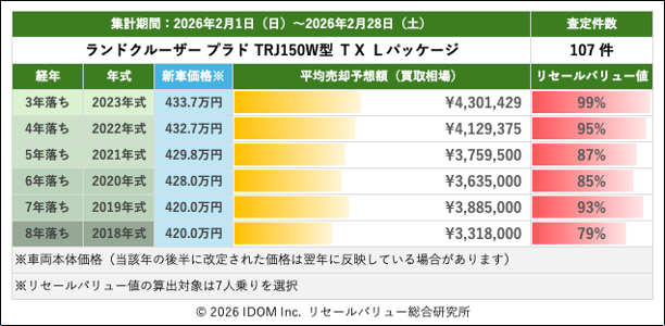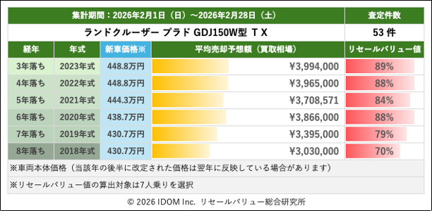 2026年2月28日(土)集計:ランドクルーザープラドの売却予想額(買取相場)リセールバリュー速報