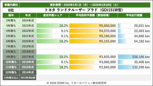 GDJ151W型(ディーゼル4WD)は査定件数が少なく、車種内順位も前回の4位から6位に後退した。3年落ちは約565万円と前回(約570万円)から小幅に下げたが、依然として150系全体で最も高い水準を保っている。6年落ちは約516万円と前回(約510万円)から微増。台数が限られるためブレは大きいものの、4WDディーゼルの希少性が価格を高位で安定させていると見てよいだろう。