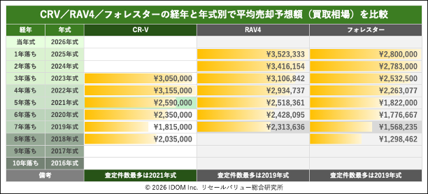 | 経年 | 年式 | CR-V | RAV4 | フォレスター |