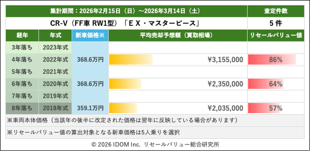 ホンダ CR-V (FF車 RW1型)「EX・マスターピース」のリセールバリュー値