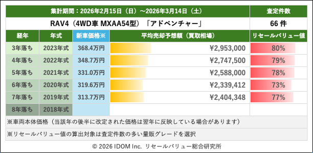 また、ホンダ車は当年式の「登録済未使用車」(登録はしているが走行距離が極端に少ない車両)が出回りやすいメーカーでもあるので、2026年式の中古車が多くで回るようであれば、3年落ちに至るまでにリセールバリューが低くなるおそれもあります。逆に、リセールバリュー値が4年落ち以降でも緩やかに下がっていくトヨタ車の強さが際立ちます。初回の車検時に乗り換える前提のクルマ選びなら、3車種の中ではRAV4の一択となるでしょう。