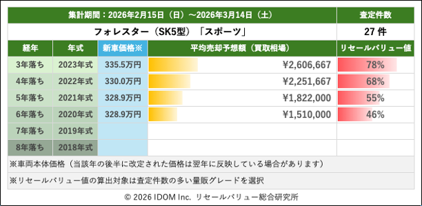 スバル フォレスター(SK5型)「スポーツ」のリセールバリュー値