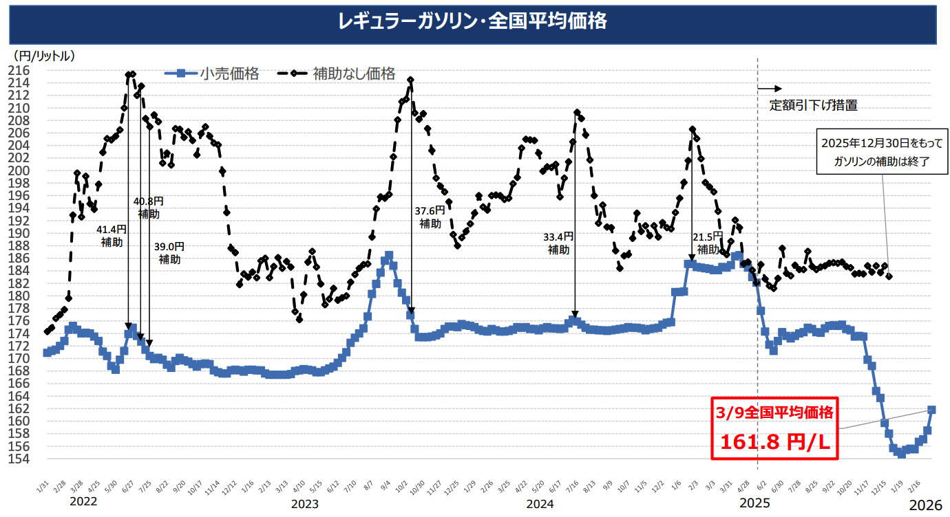 まずは、これまでのガソリン価格と今後の見通しについて整理してみましょう。資源エネルギー庁がまとめた2022年以降のレギュラーガソリン全国平均価格の推移を見てみると、政府によるガソリン価格の補助によって実売価格はある程度抑えられているものの、補助金を含めない価格は2022年から乱高下を続けており、1リットルあたり200円を超えることも多かったことがわかります。店頭に表示される実売価格では実感できませんでしたが、ガソリン価格は私たちが思っているよりも大きく変動し、しかも高止まりの状況が続いていたのです。