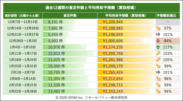 | 過去12週間の査定件数と平均売却予想額(買取相場) | |||