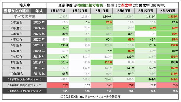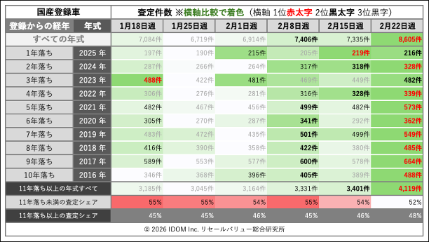 国産登録車の査定件数は8,605件で、前週の7,335件から約17%増えた。直近6週間で最も多く、年度末に向けた買い替えの動きが広がっていることがうかがえる。