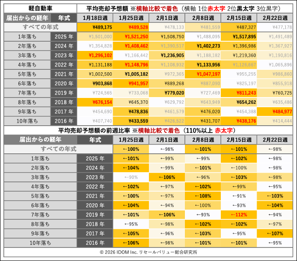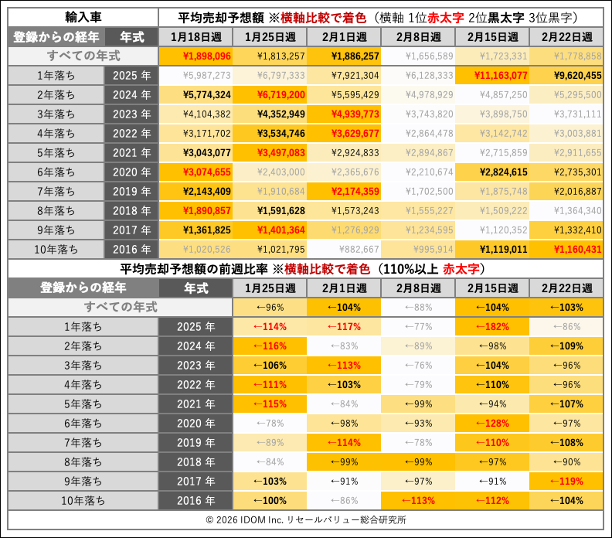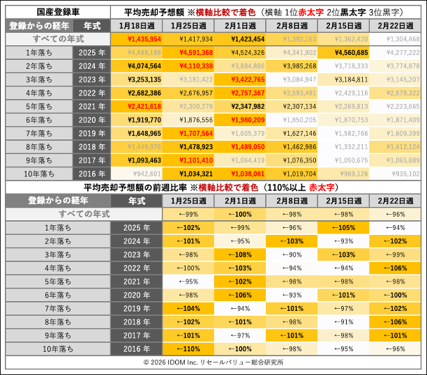 【週刊リセールバリュー】2026年第9週(2月22日週)の中古車買取相場/査定件数と売却予想額の推移