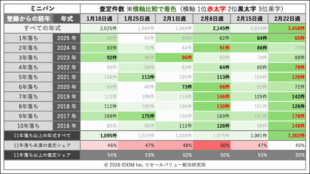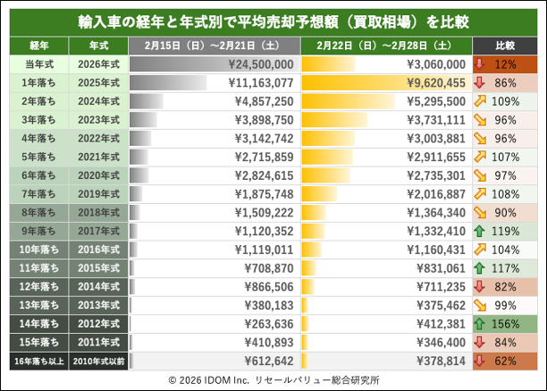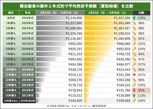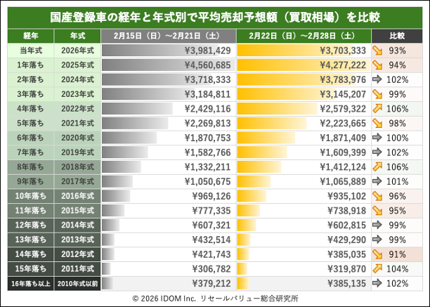| 経年 | 年式 | 2月15日(日)〜2月21日(土) | 2月22日(日)〜2月28日(土) | 比較 |