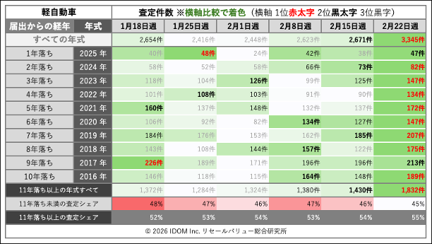 軽自動車の査定件数は3,345件となり、前週の2,671件から約25%の急増となった。直近6週間で突出した件数であり、年度末の買い替えシーズンに合わせた軽自動車の放出が加速している。