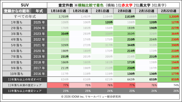 SUVの査定件数は3,300件で、前週の2,688件から約23%増えた。直近6週間で最多を更新しており、SUV人気を背景に売却に動くオーナーが増えている。