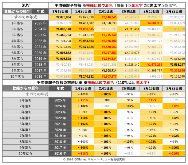 10年落ちの急伸は、海外輸出向けの引き合いが根強いことをうかがわせる動きだ。一方、2025年式(1年落ち)は前週比87%(約405万円)と大きく値を下げており、高年式SUVは台数が増えたぶん相場が重くなっている。