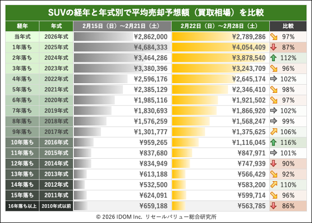 SUV全体の平均売却予想額(買取相場)は約196万円で、前週の約203万円から前週比96%と下落した。年式別では、2024年式(2年落ち)が前週比112%(約386万円)と目を引く上げを見せたほか、2016年式(10年落ち)も同116%(約112万円)と大幅に値を上げた。