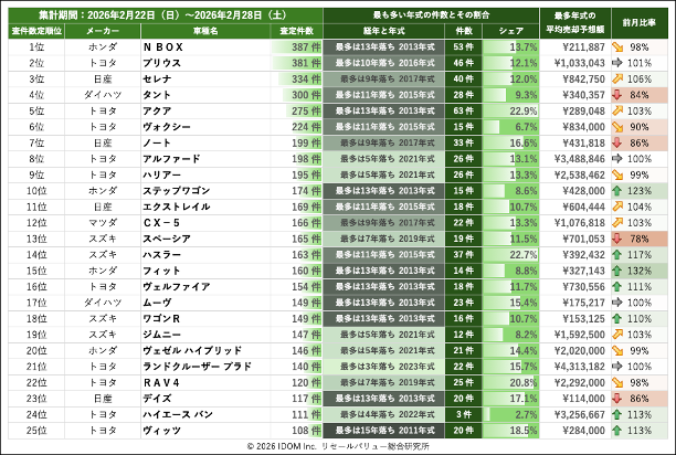 週間ランキング:査定件数が1〜25位の車種と平均売却予想額(買取相場)の変化