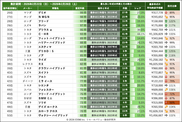 週間ランキング:査定件数が26〜50位の車種と平均売却予想額(買取相場)の変化
