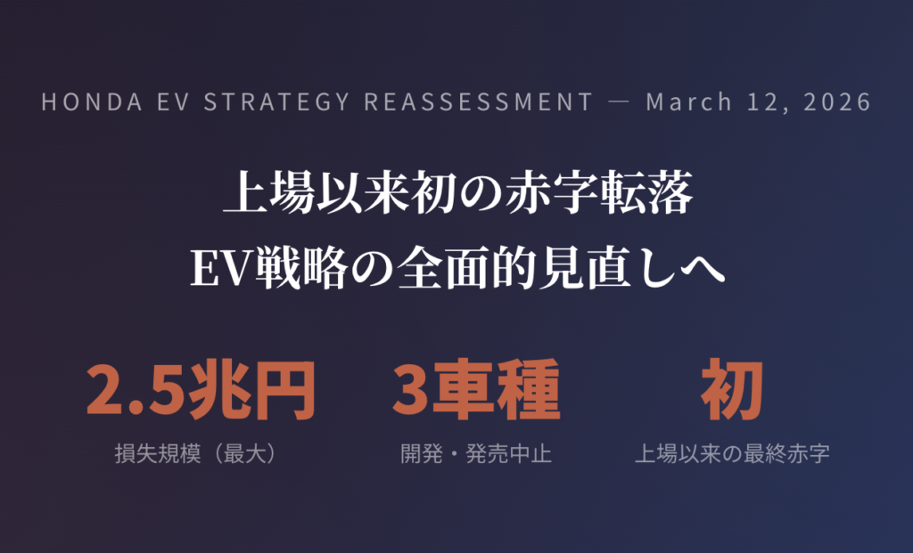 2026年3月12日、ホンダ(本田技研工業)は四輪電動化戦略の見直しに伴い、北米で生産予定だったEV3車種の開発・発売を中止すると発表しました。同時に、関連損失が最大2兆5000億円に達する可能性があること、2026年3月期の連結業績が上場以来初の赤字に転落する見通しであることを明らかにしています。
