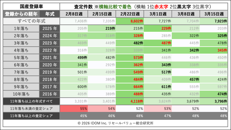国産登録車の査定件数は7,923件で、前週の7,704件から約3%増加した。直近6週では第9週(8,602件)に次ぐ水準であり、第8週(7,335件)を底に安定した回復基調が続いている。11年落ち以上が3,796件と厚みを増しており、経年車の売却が活発だ。