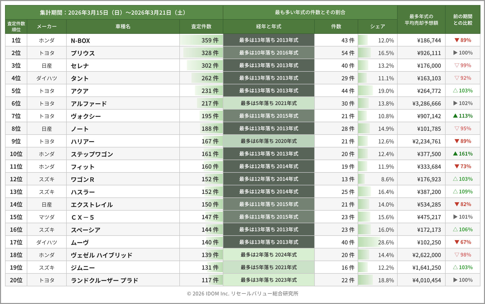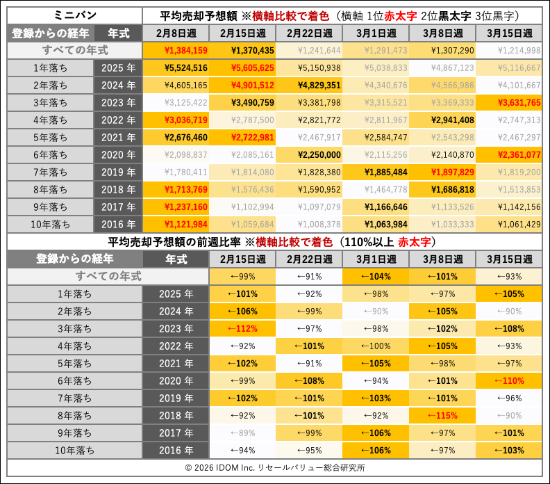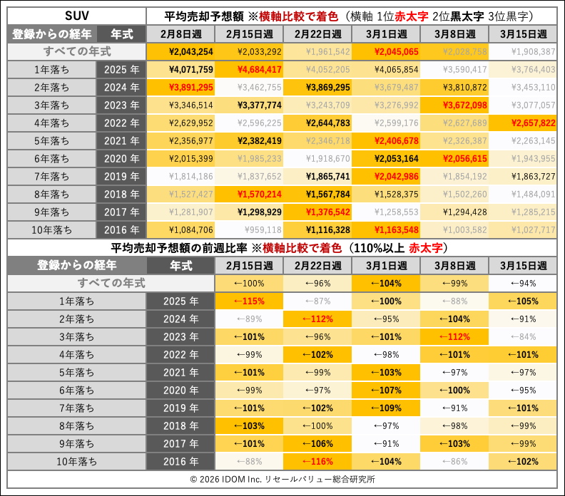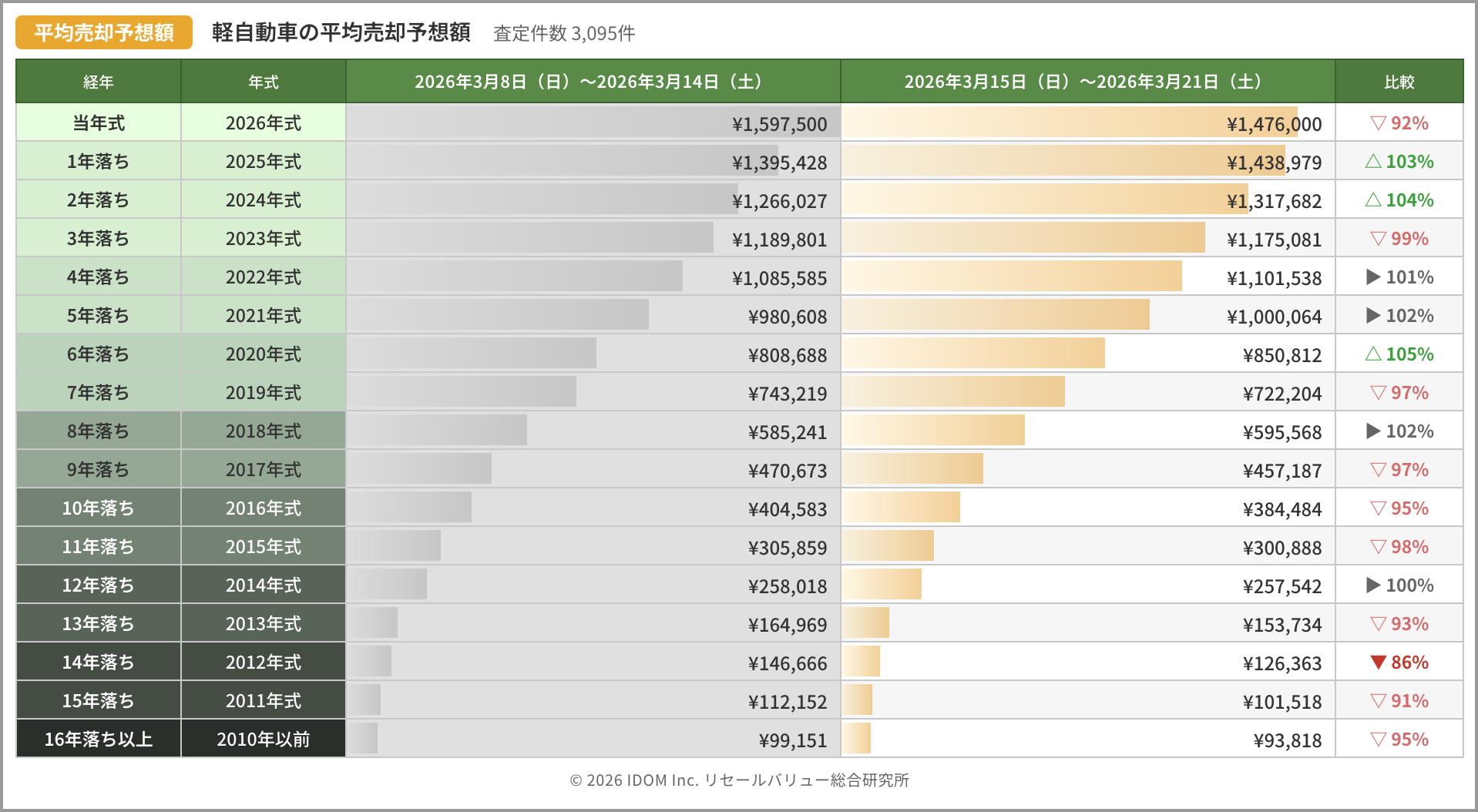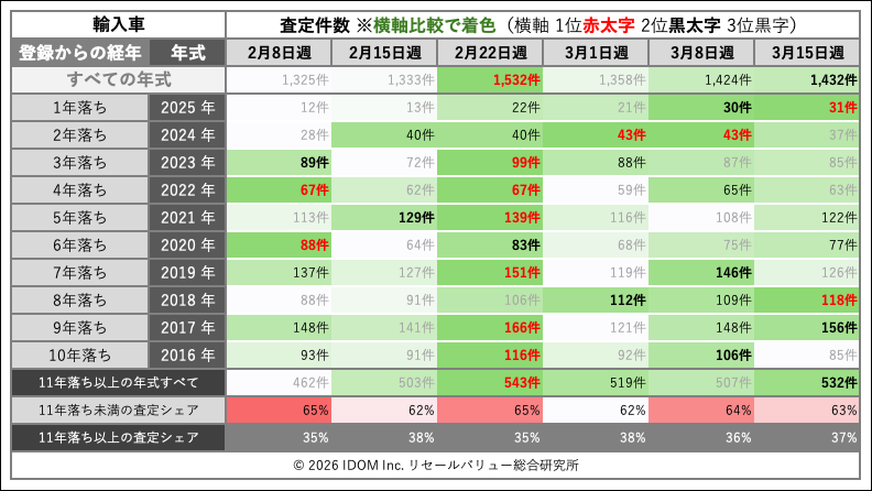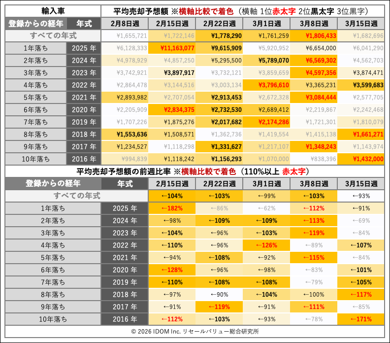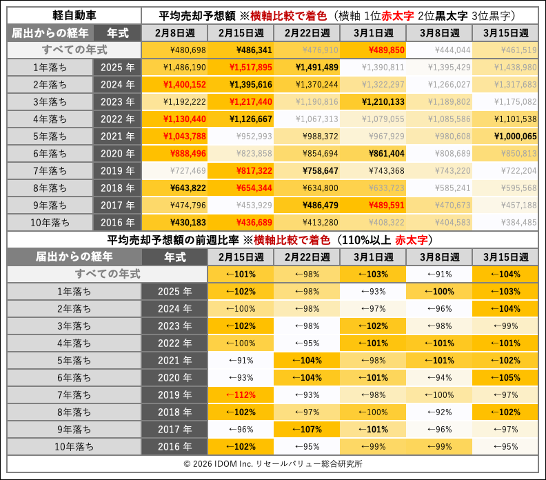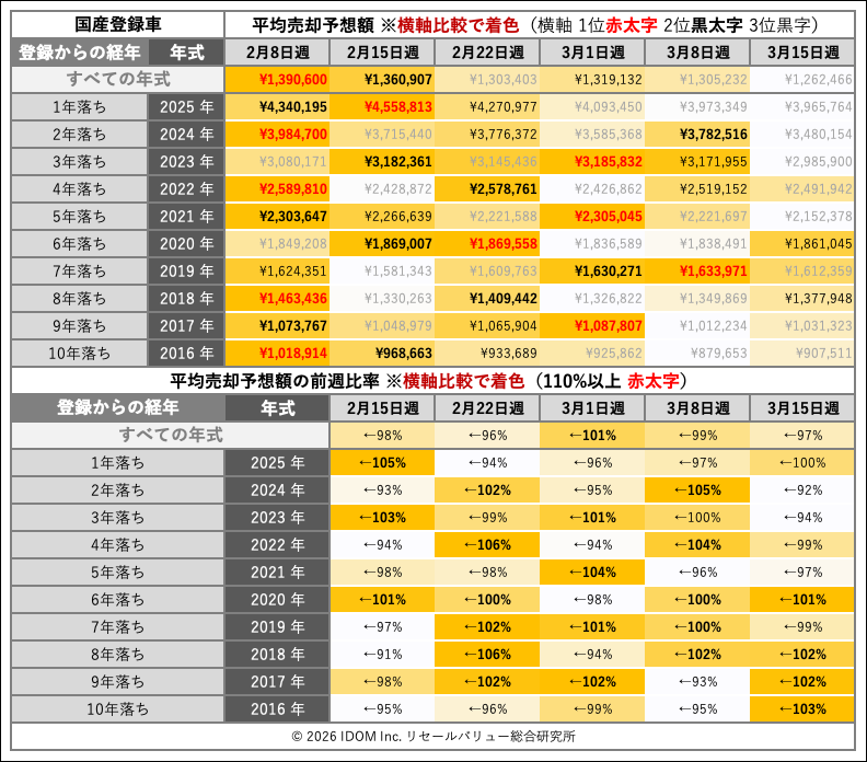 | 経年 | 年式 | 2026年3月8日〜2026年3月14日 | 2026年3月15日〜2026年3月21日 | 比較 |