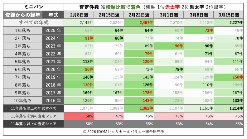 ミニバンの査定件数は2,227件で、前週の2,118件から約5%増加した。7年落ち(2019年式)が150件と6週間で最多を付け、10年落ち(2016年式)も133件と前週の102件から大きく伸びている。一方、1年落ち(2025年式)は48件と前週の73件から絞られた。