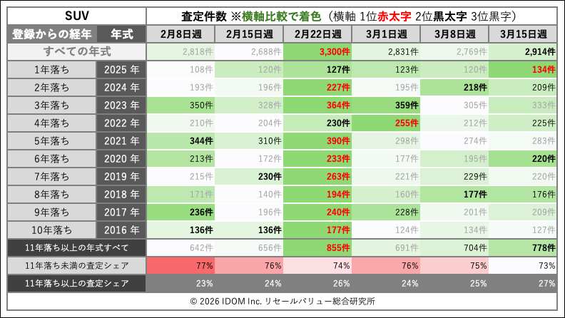 SUVの査定件数は2,914件で、前週の2,769件から約5%増えた。6年落ち(2020年式)が220件と前週の195件から増加し、11年落ち以上も778件と前週の704件から膨らんでいる。直近6週では第9週(3,300件)に次ぐ水準となった。