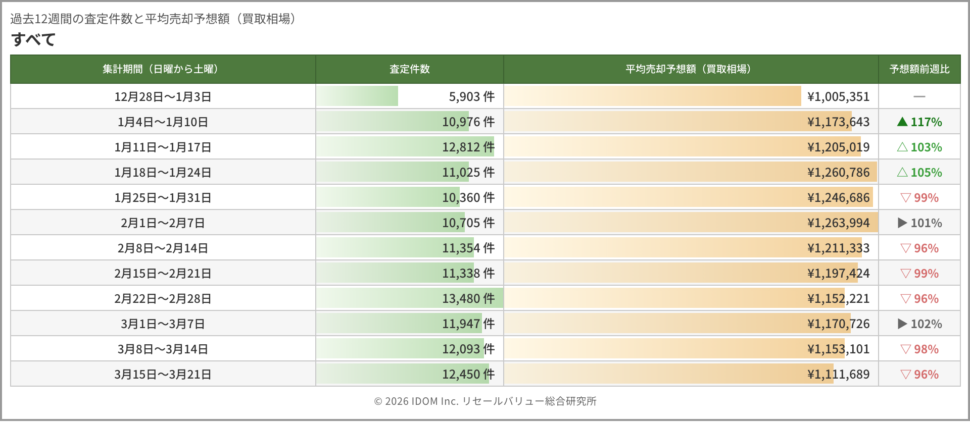 | 過去12週間の査定件数と平均売却予想額(買取相場) | |||